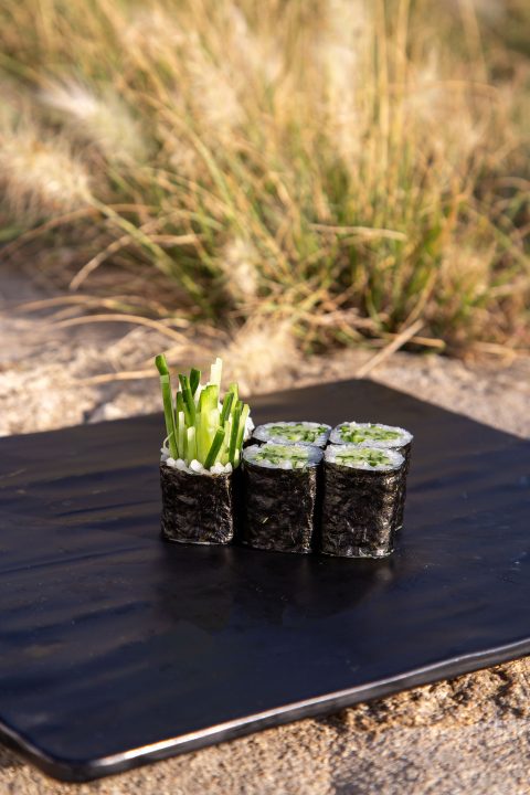 5 pcs futomaki (vegan) | Red lettuce, white lettuce, carrot, cucumber, avocado, chives, ginger, asparagus, negi, daikon, shiso
